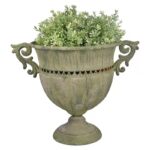 Antik hatású kerti virágcserép, zöldes-barnás színben. A francia kertek hangulatát idézi különleges antikolt felületének köszönhetően. A virágcserép alján vízelvezető nyílás segíti a felesleges víz kifolyását, így nemcsak különleges hangulatot teremt, hanem virággal és növénnyel is beültethető. Dekorációs elemként is megállja a helyét a kertben.