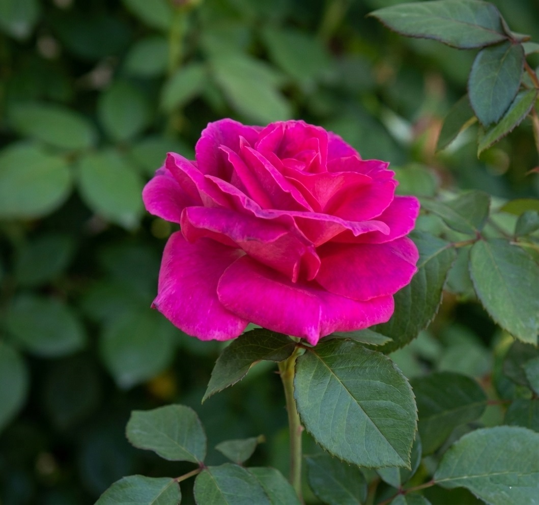 Virág: élénk magenta, mély rózsaszín, szinte bíborba hajló, erősen telt, rozetta formájú virágok